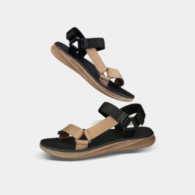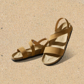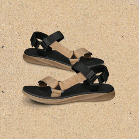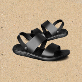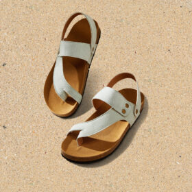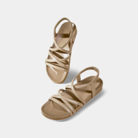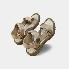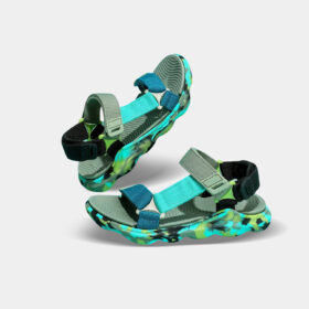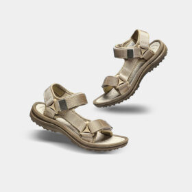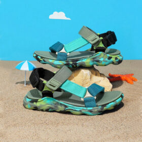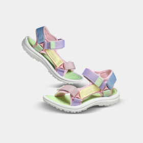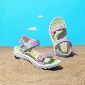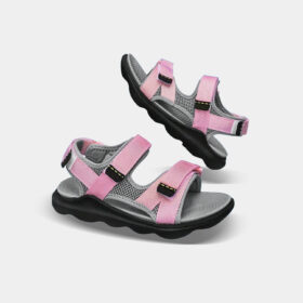 A sporty open-toe sandal with pink adjustable straps, a gray cushioned mesh footbed, and a sturdy black rubber sole — blending comfort, durability, and playful style.