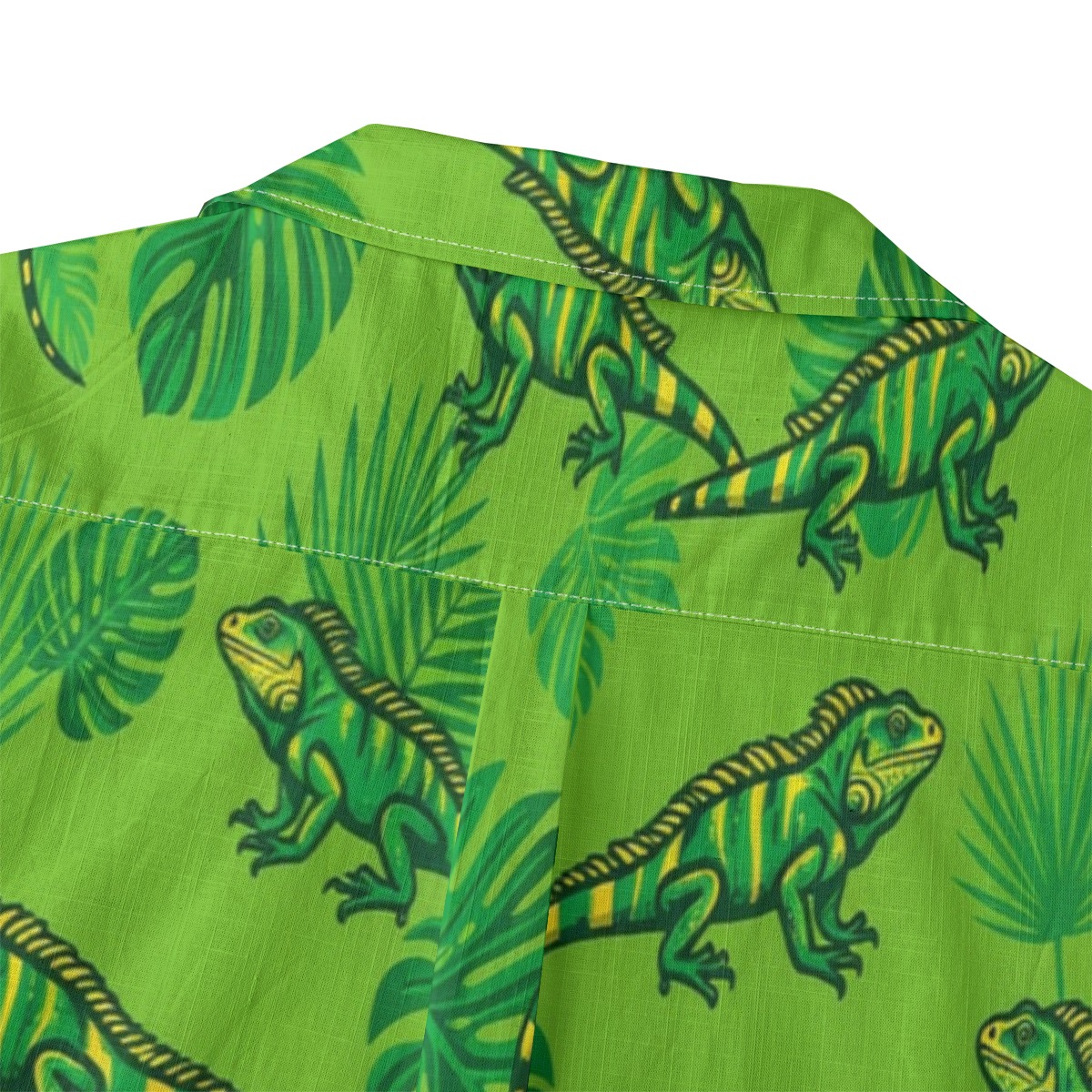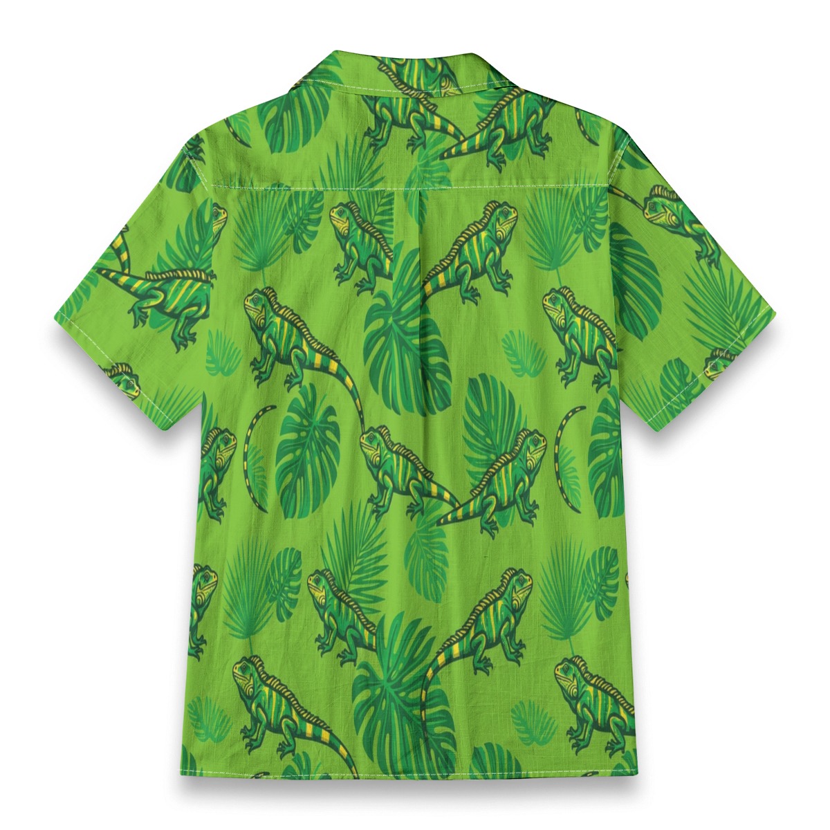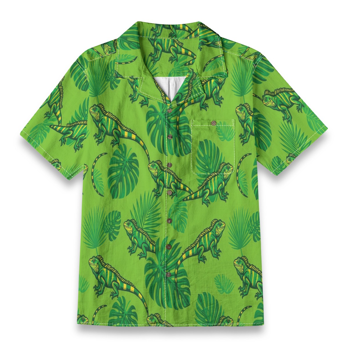 Vivid iguanas blend seamlessly with lush leaves in a bright and energetic pattern. Vibrant greens and yellow accents create a sunlit tropical vibe. The evenly spaced layout keeps the design dynamic and eye-catching.