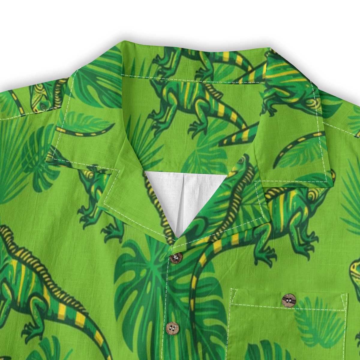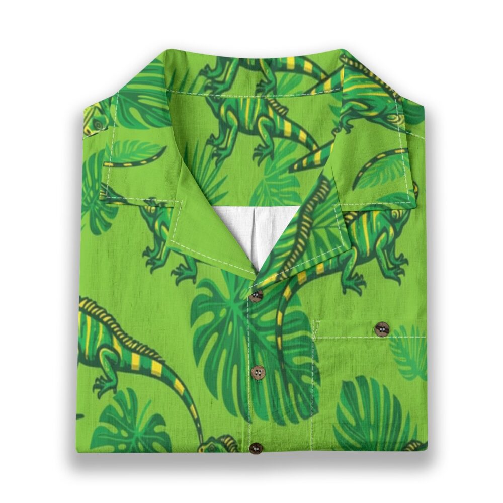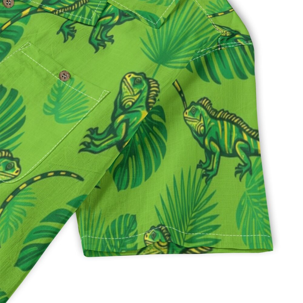 Vivid iguanas blend seamlessly with lush leaves in a bright and energetic pattern. Vibrant greens and yellow accents create a sunlit tropical vibe. The evenly spaced layout keeps the design dynamic and eye-catching.