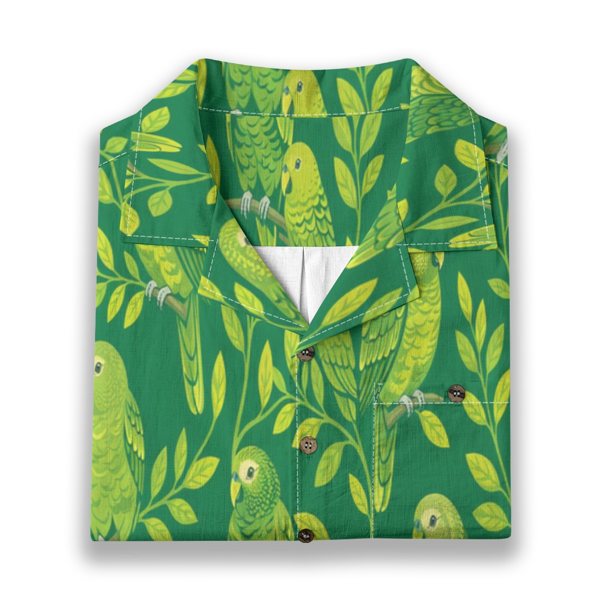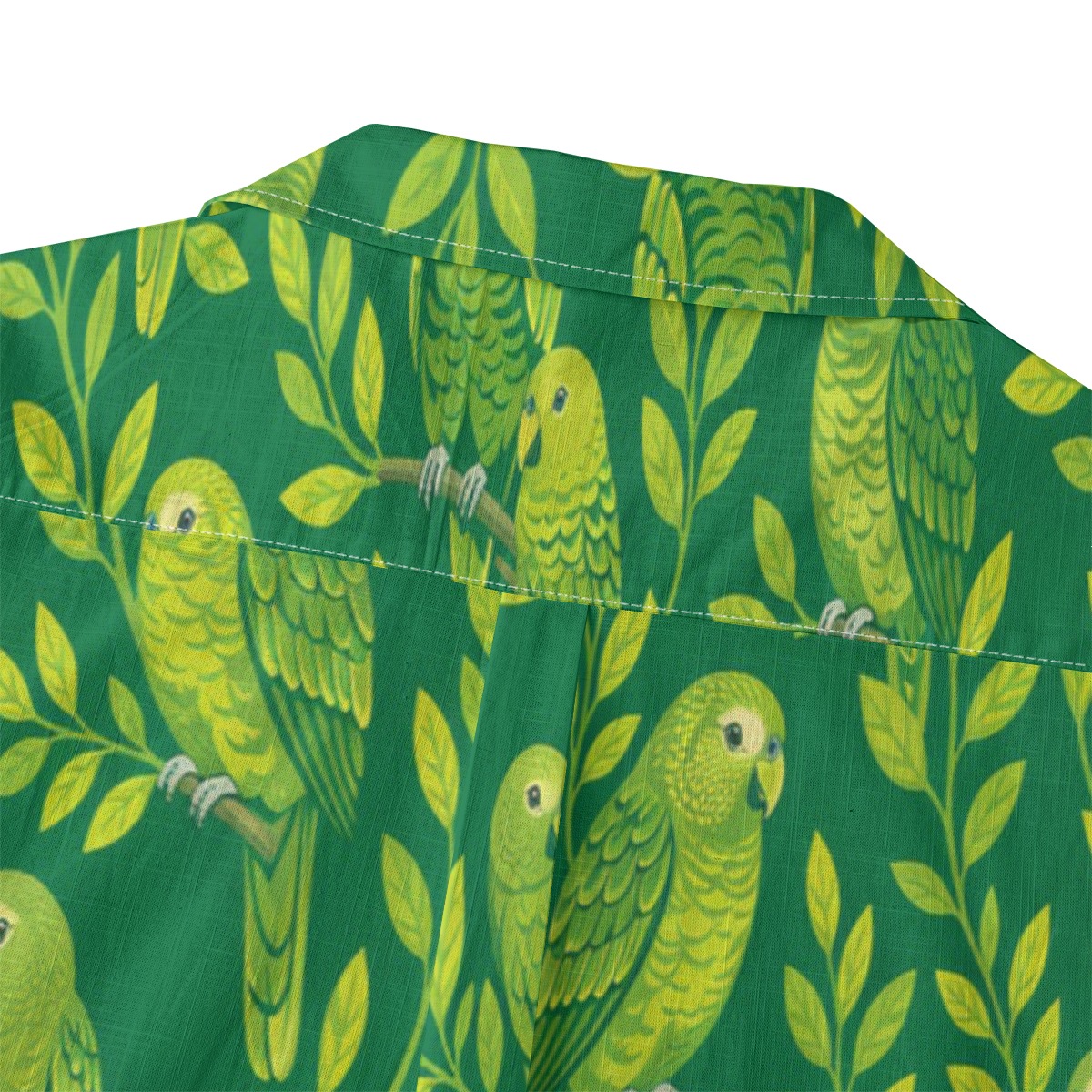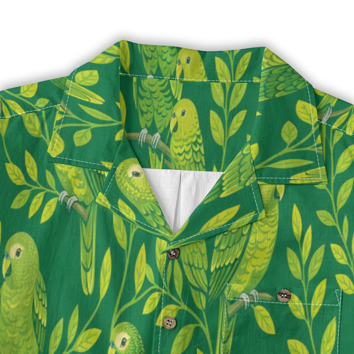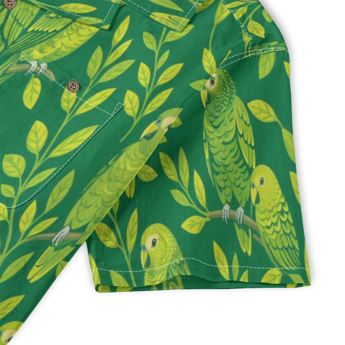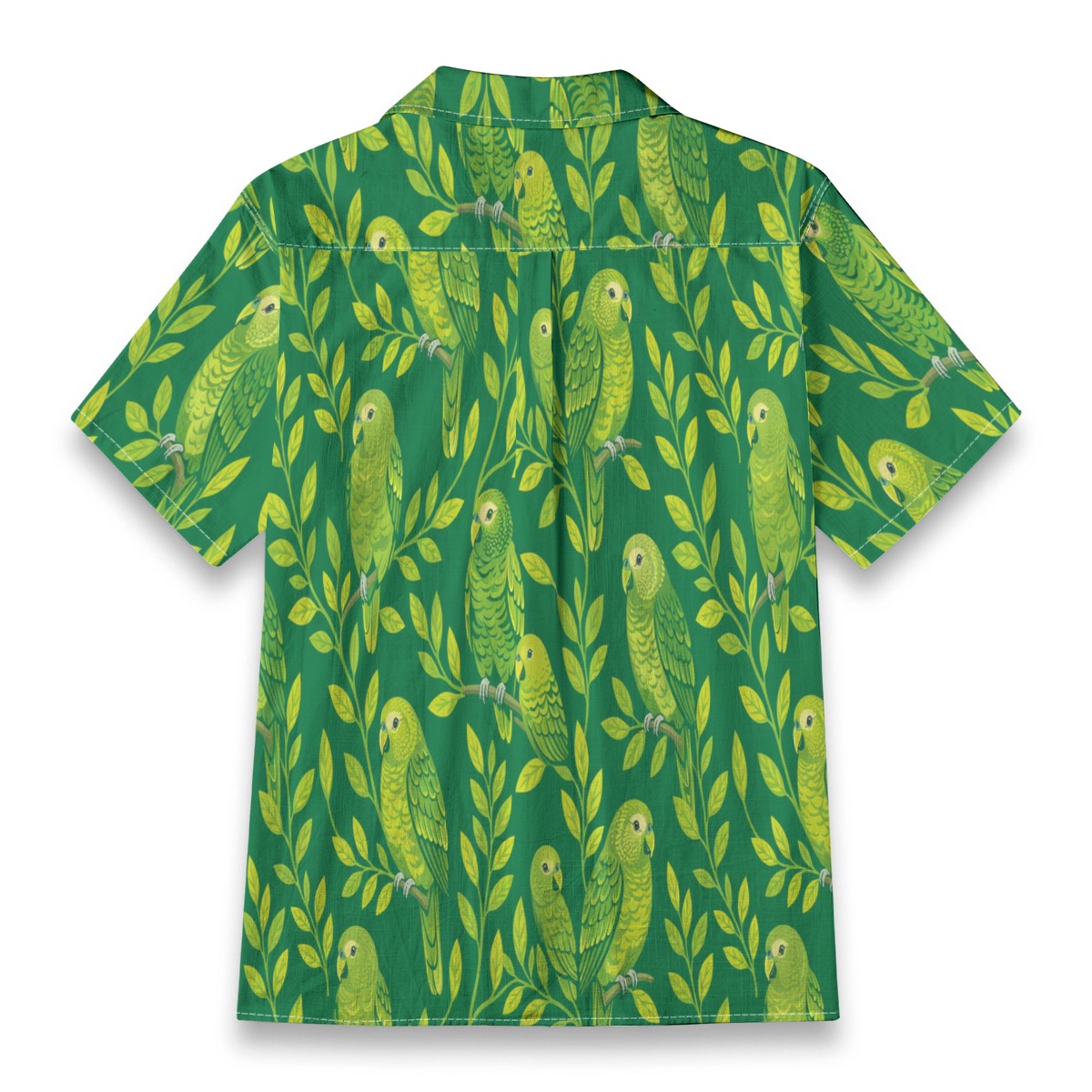Charming kakapo parrots blend into leafy branches, forming a vibrant and lively pattern. The rich green background enhances the bright tones, while the evenly spaced layout creates a cohesive tropical rhythm.