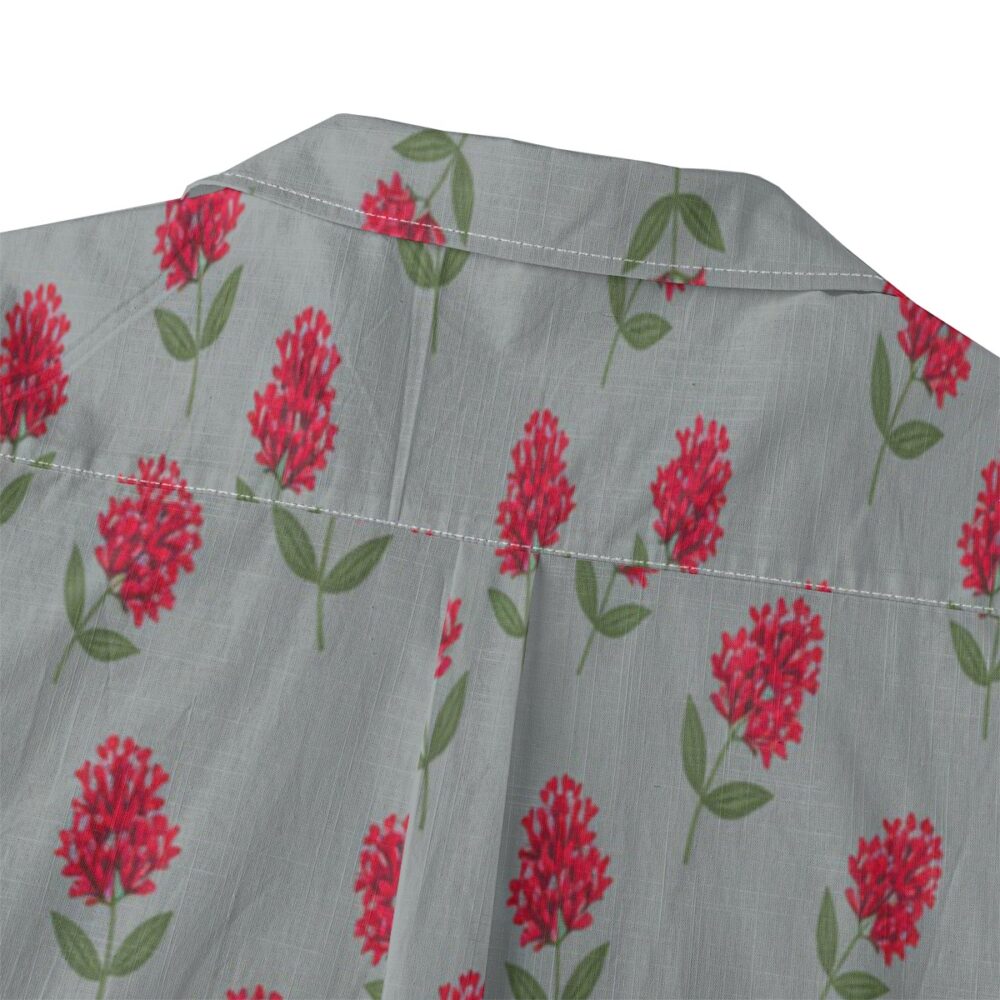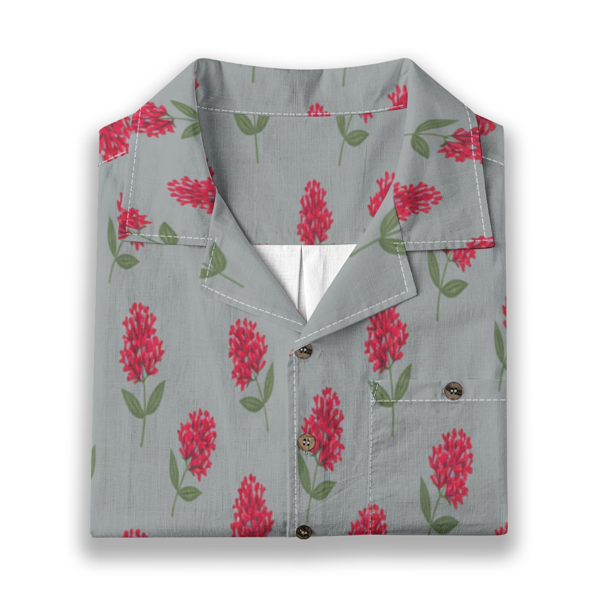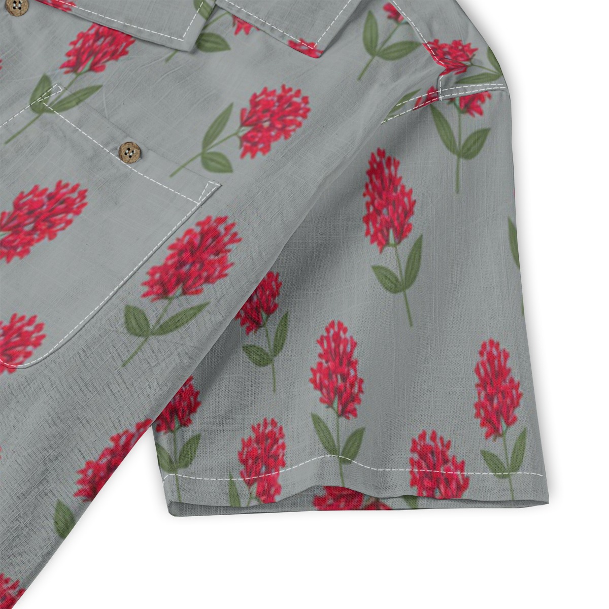 Vivid red valerian blooms stand out against a soft gray base, creating a striking yet balanced pattern. The green leaves add depth, while the evenly spaced layout keeps the design cohesive and lively.