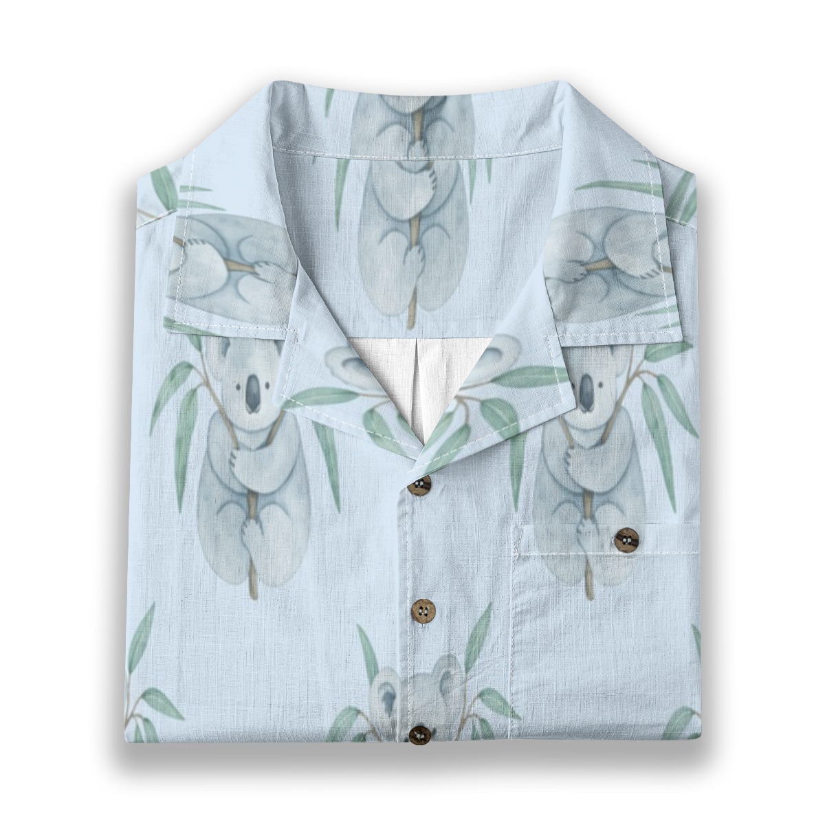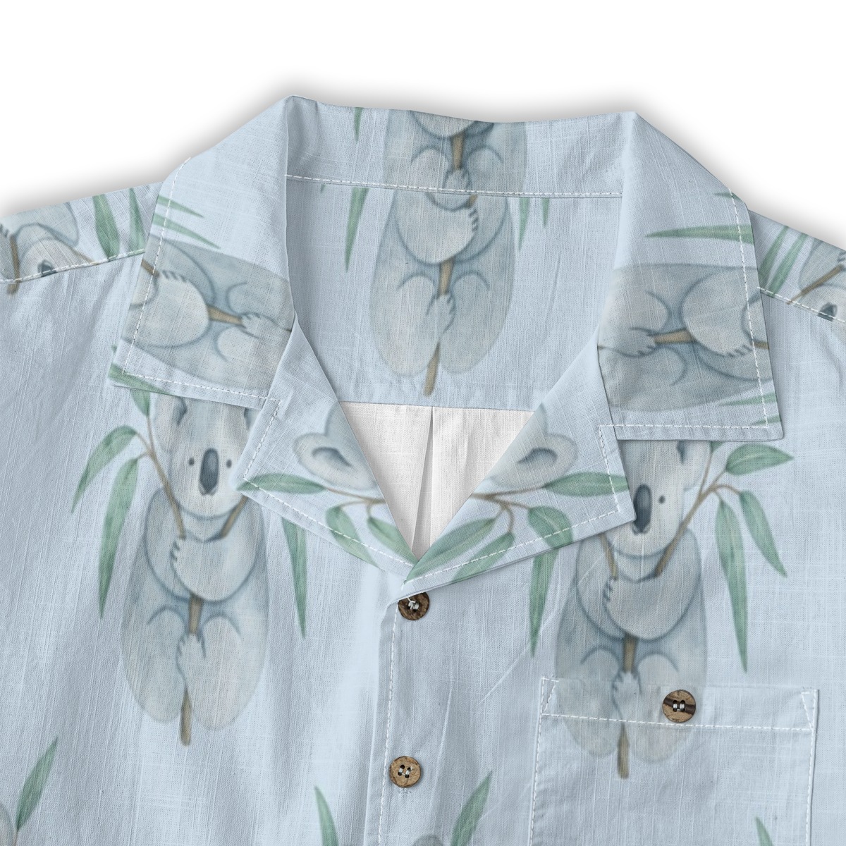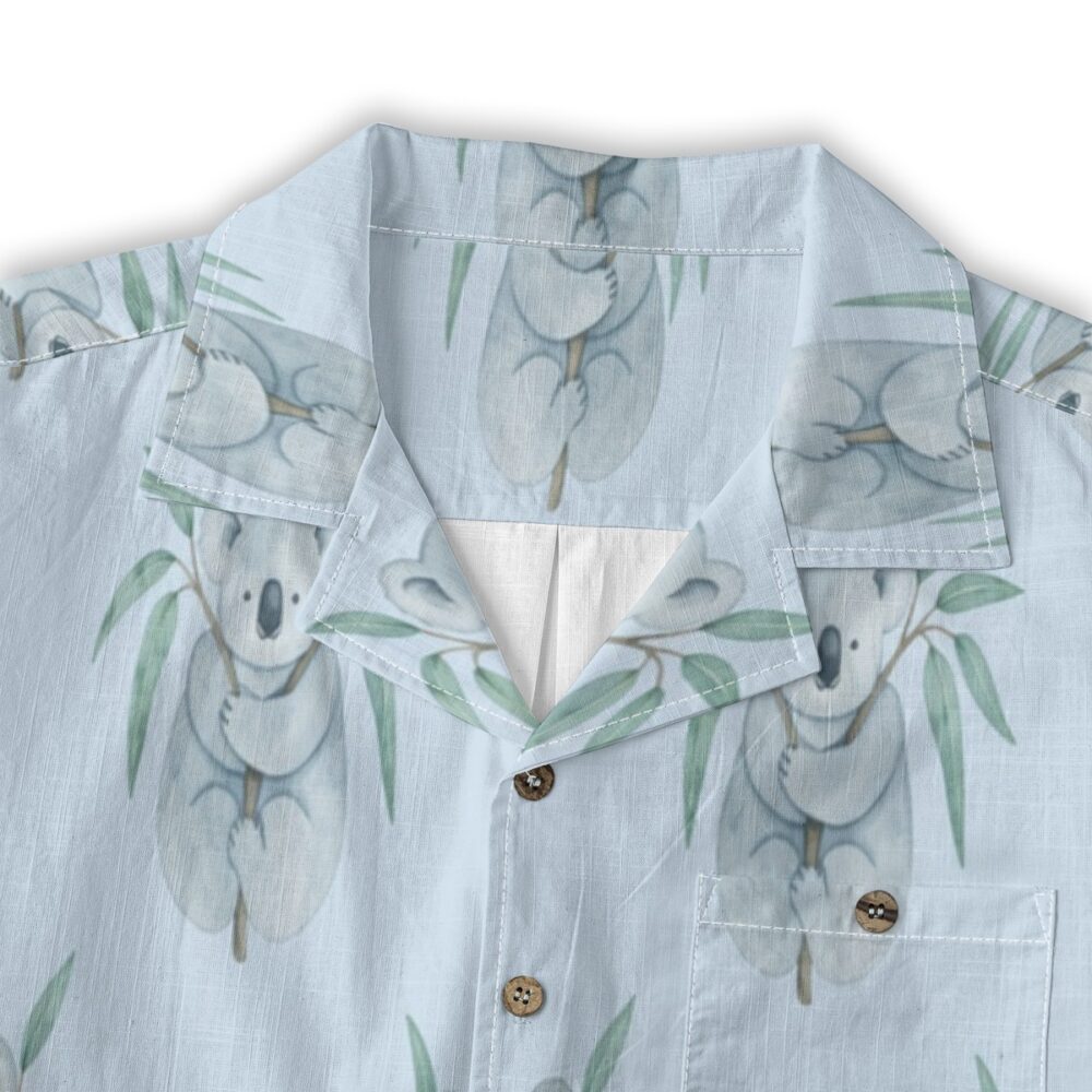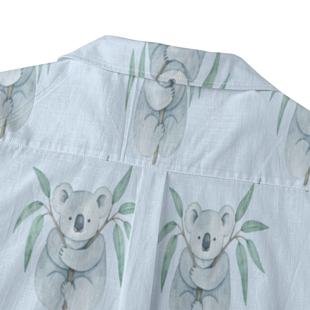 Peaceful koalas cling to drifting eucalyptus leaves in a soft watercolor pattern. Gentle blues and greens blend harmoniously, creating a calming visual flow. The repeating layout enhances the tranquil, breezy island vibe.