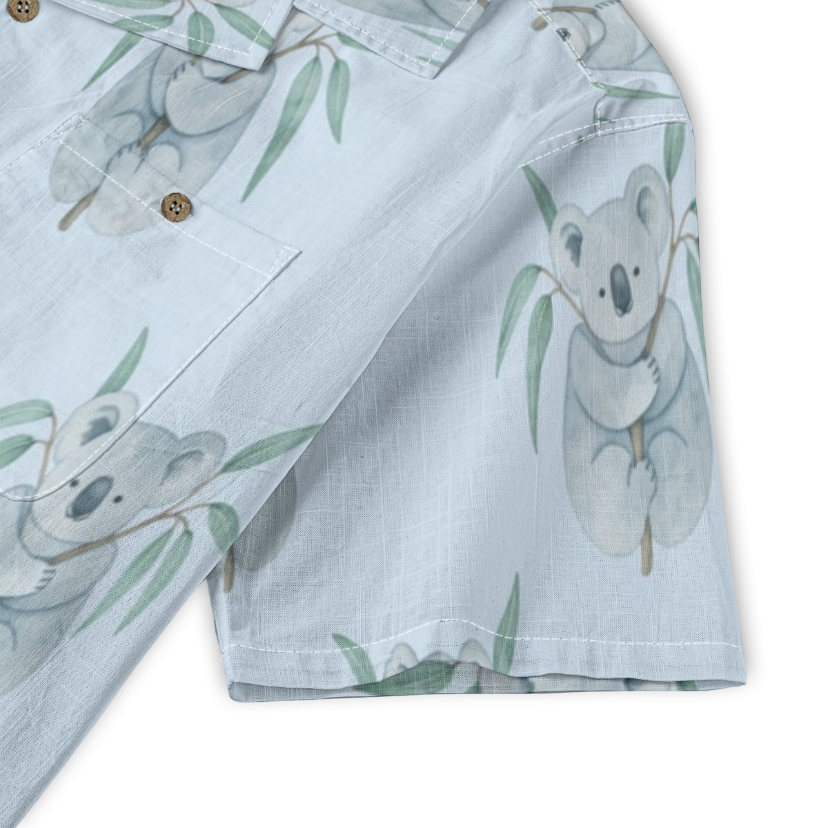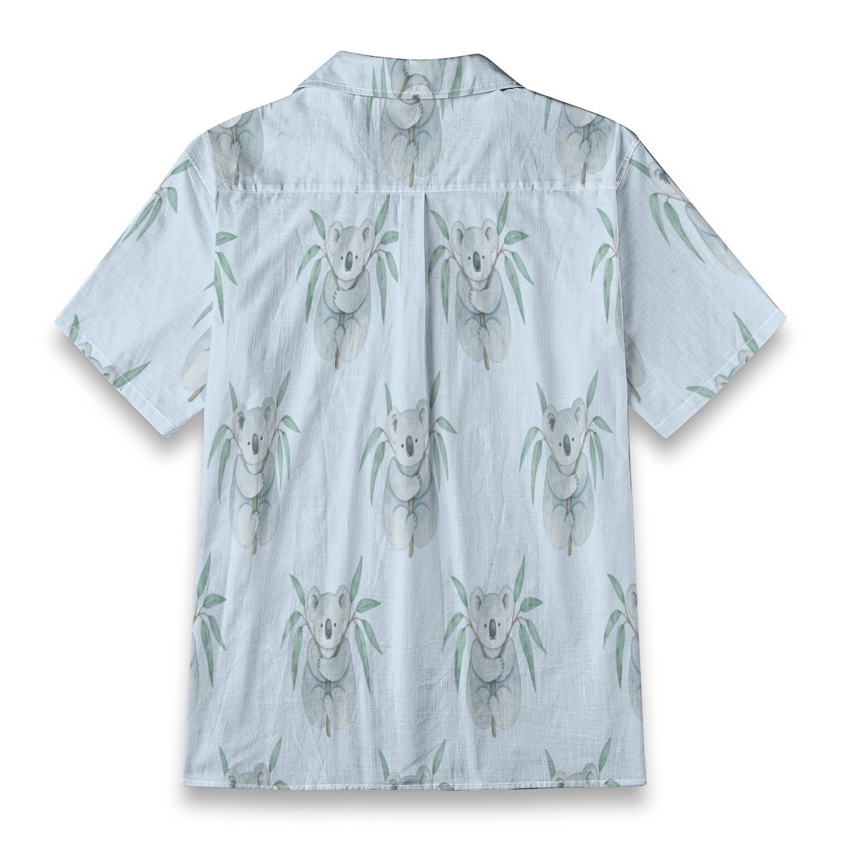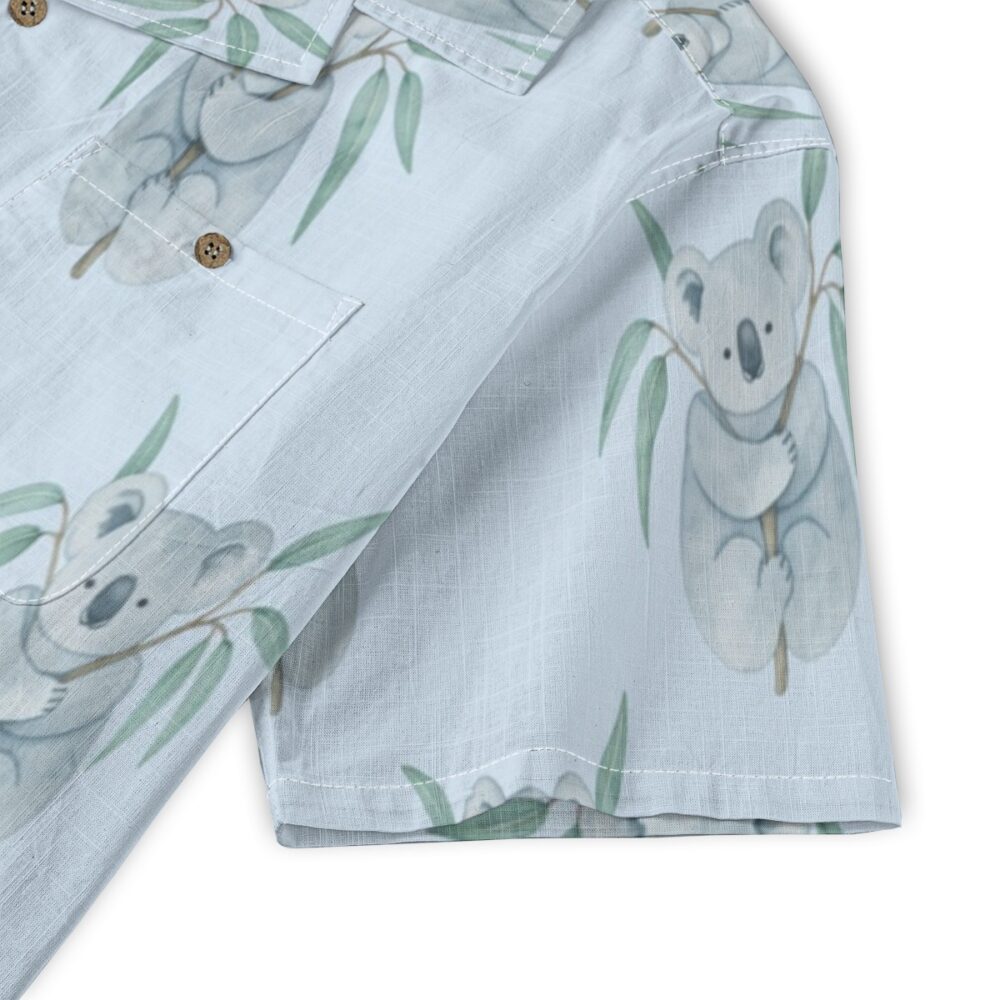 Peaceful koalas cling to drifting eucalyptus leaves in a soft watercolor pattern. Gentle blues and greens blend harmoniously, creating a calming visual flow. The repeating layout enhances the tranquil, breezy island vibe.
