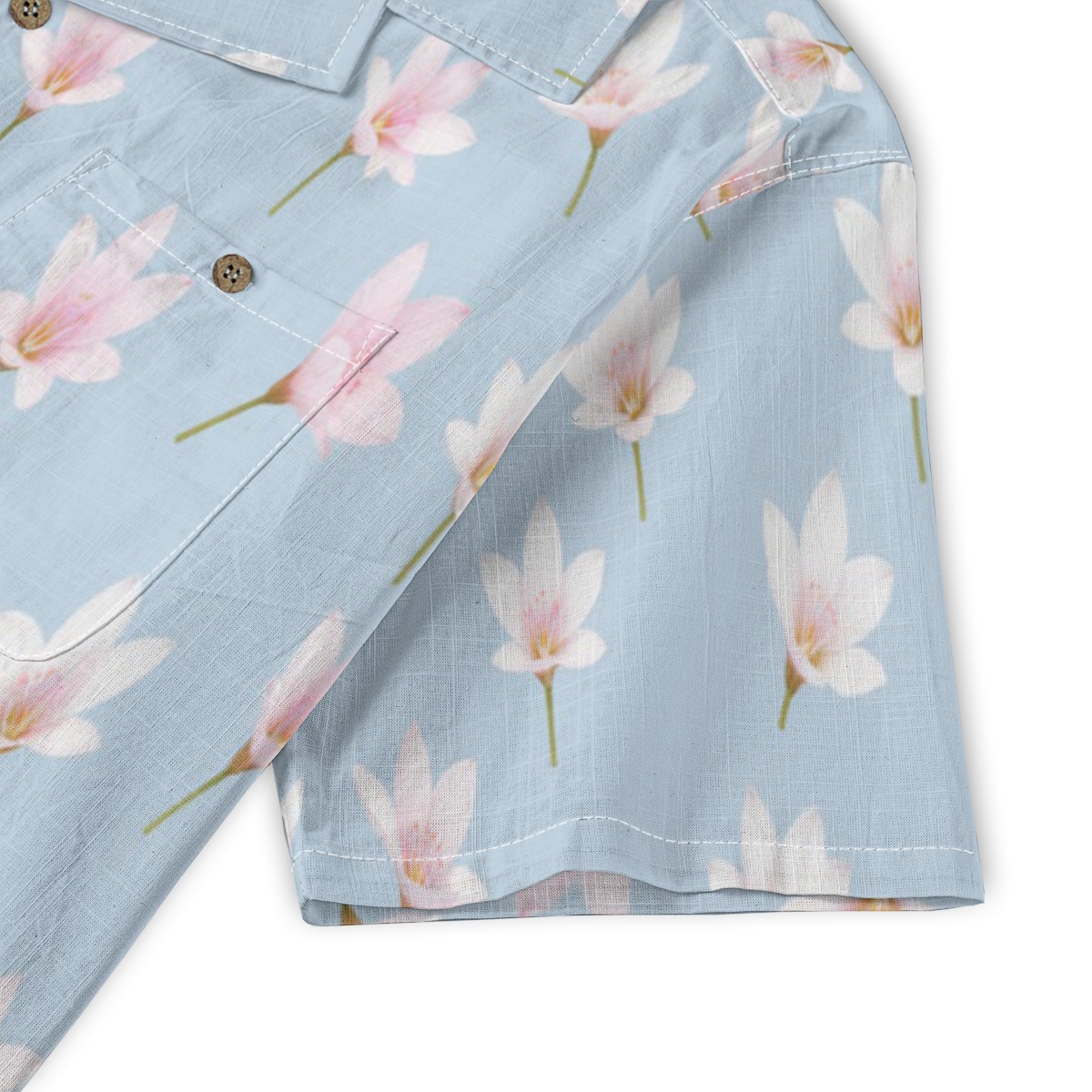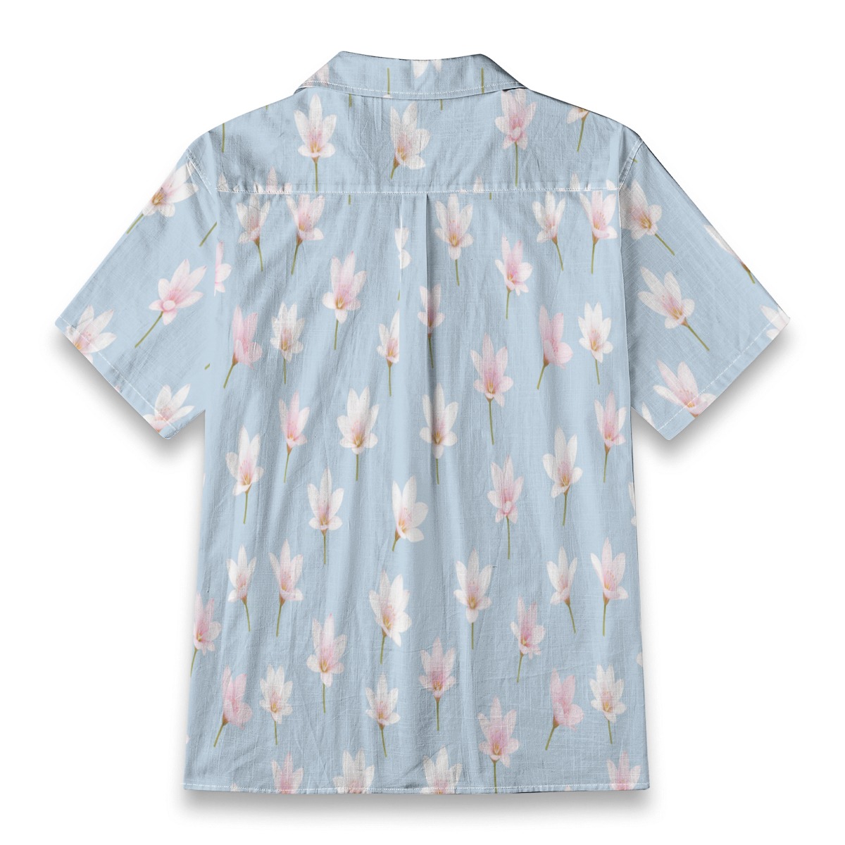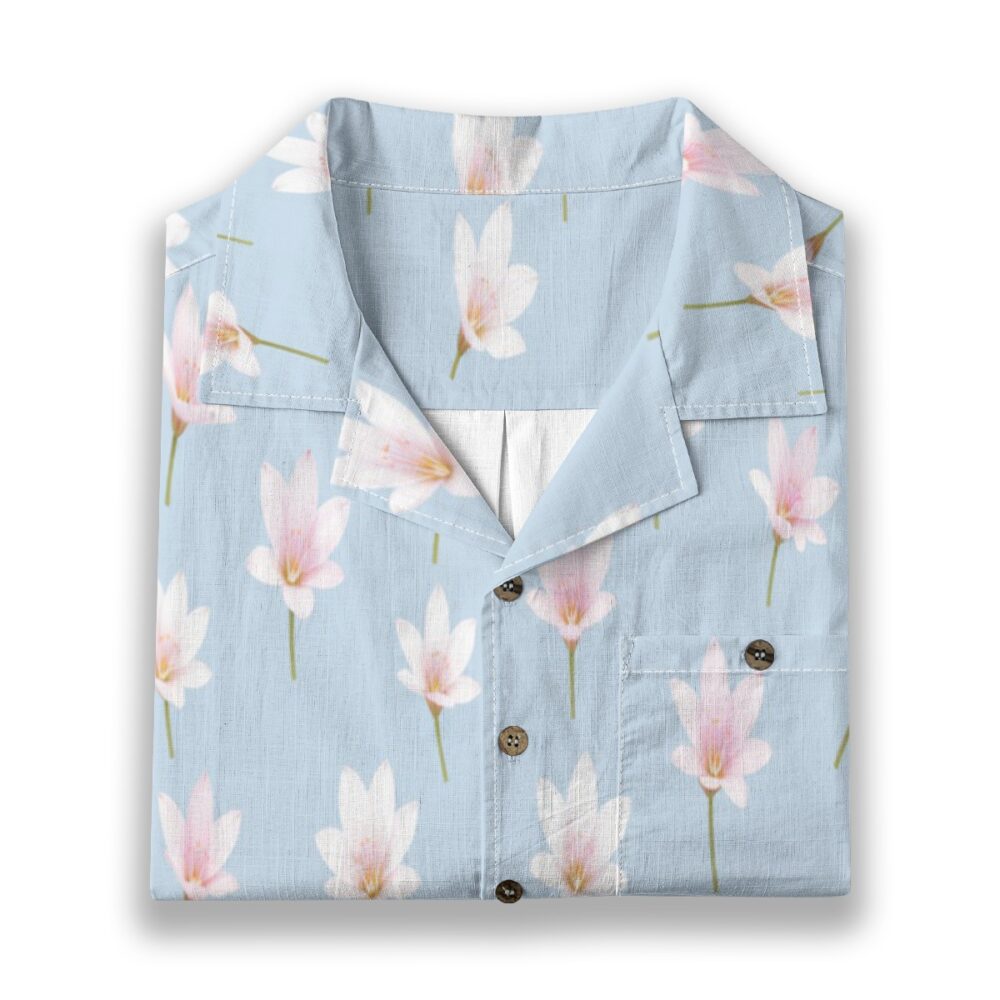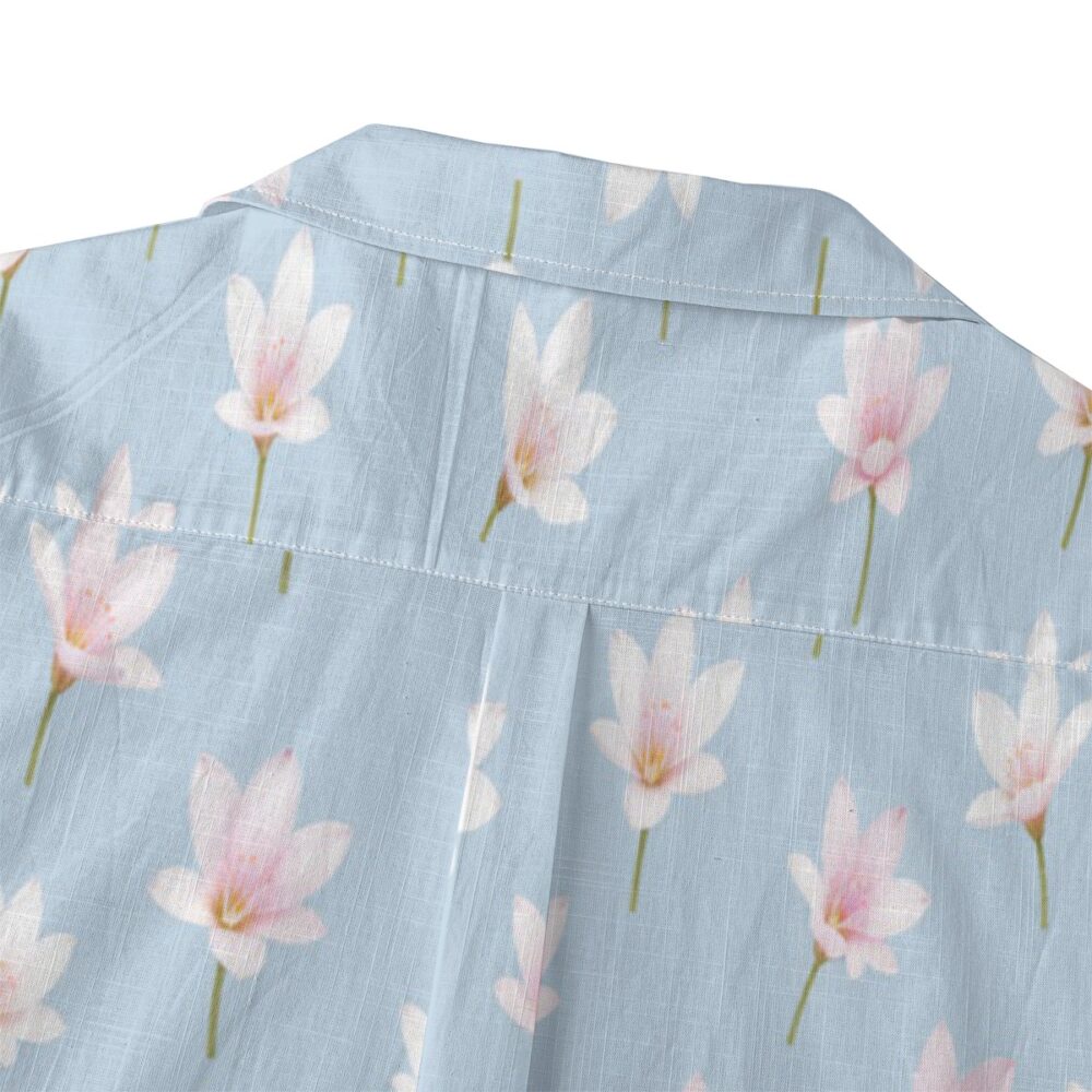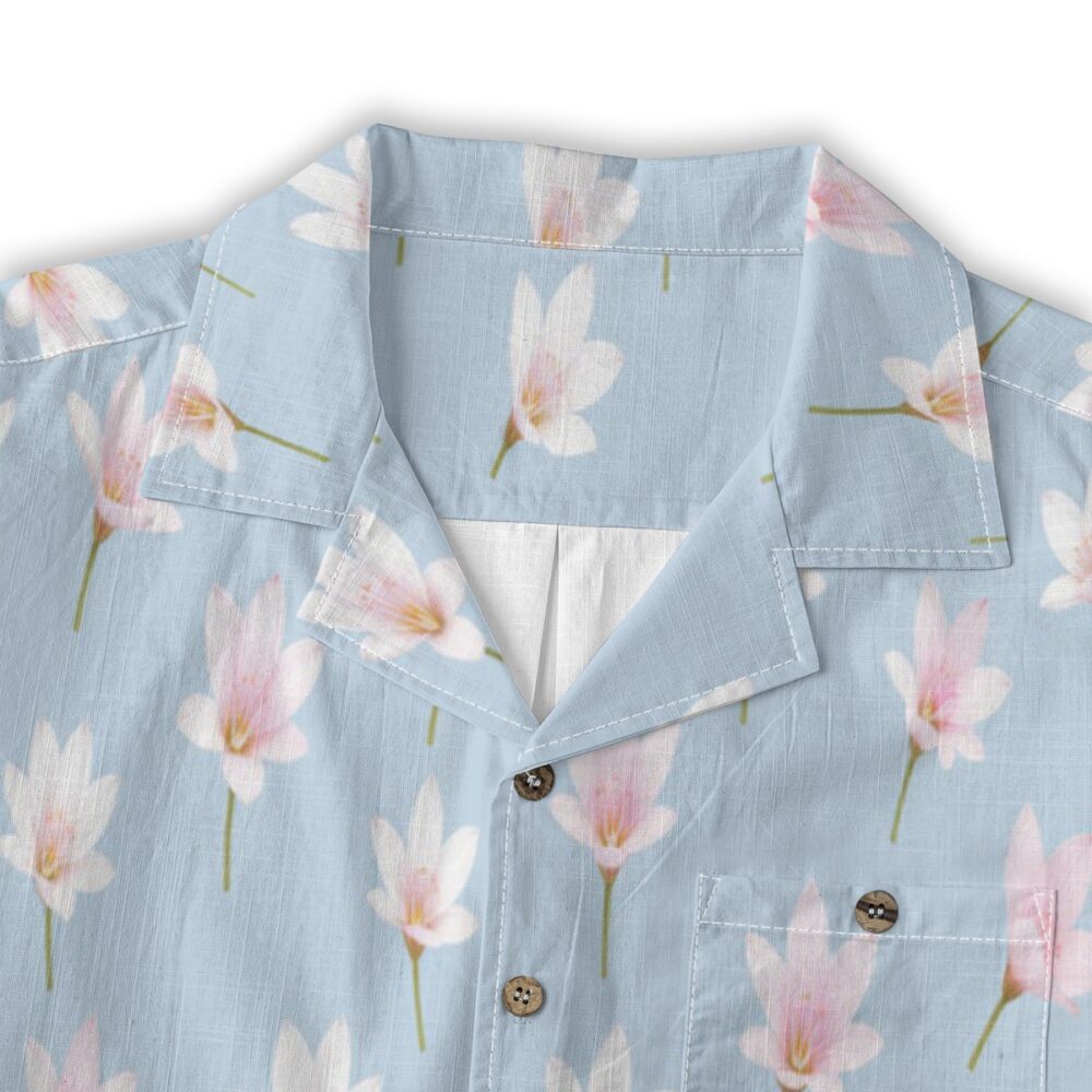 Gentle zephyranthes blossoms appear across a pale blue base, creating a light and airy pattern. Soft whites and pinks add subtle contrast, while the evenly spaced layout keeps the design calm and refreshing.